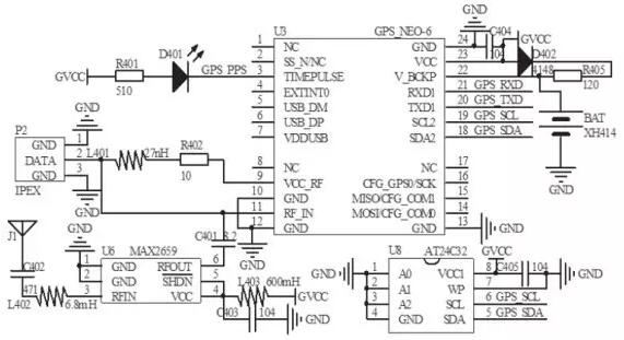 GPS模塊電路如圖3所示,該電路以U—Blox公司的GPS芯片NEO-6M為核心,在主控制器的控制下實(shí)現(xiàn)GPS的定位功能,GPS芯片與主控制器之間通過串行總線通信,電路中的EE PROM(Electrically Erasable Programmable Read-Only Memory)芯片AT24C32用來保存GPS的相關(guān)設(shè)置參數(shù)。