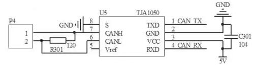 CAN接口電路如圖4所示,STM32F103系列單片機(jī)自帶CAN網(wǎng)絡(luò)接口,因此,只需要在主控制器與汽車CAN網(wǎng)絡(luò)之間加一個總線驅(qū)動器,本文選用具有差動發(fā)送和差動接收功能的TJA1050。該電路將主控制器與車載網(wǎng)絡(luò)連接,主控制器可以通過車載網(wǎng)絡(luò)獲取汽車門開關(guān)、鎖車信息等汽車狀態(tài),也可以在緊急情況下向車身控制模塊發(fā)出命令,切斷燃油泵的供電。