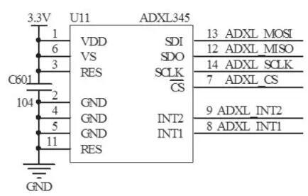 加速度模塊電路如圖5所示,ADXL345是美國亞諾德半導(dǎo)體公司(Analog Devices)生產(chǎn)的一款數(shù)字式三軸加速度計,具有小巧輕薄、超低功耗、可變量程、高分辨率等特點(diǎn),其輸出采用I2C和SPI總線。該電路用以檢測車身姿態(tài)及運(yùn)動狀態(tài),車主通過遙控器鎖車后,主控制讀取汽車當(dāng)前的車身姿態(tài)信息作為初始值,當(dāng)車身發(fā)生振動、傾側(cè)、移動時,其三軸的輸出值與該初始值進(jìn)行比較,當(dāng)兩者的差值超過設(shè)定值時,即判定為非法情況。