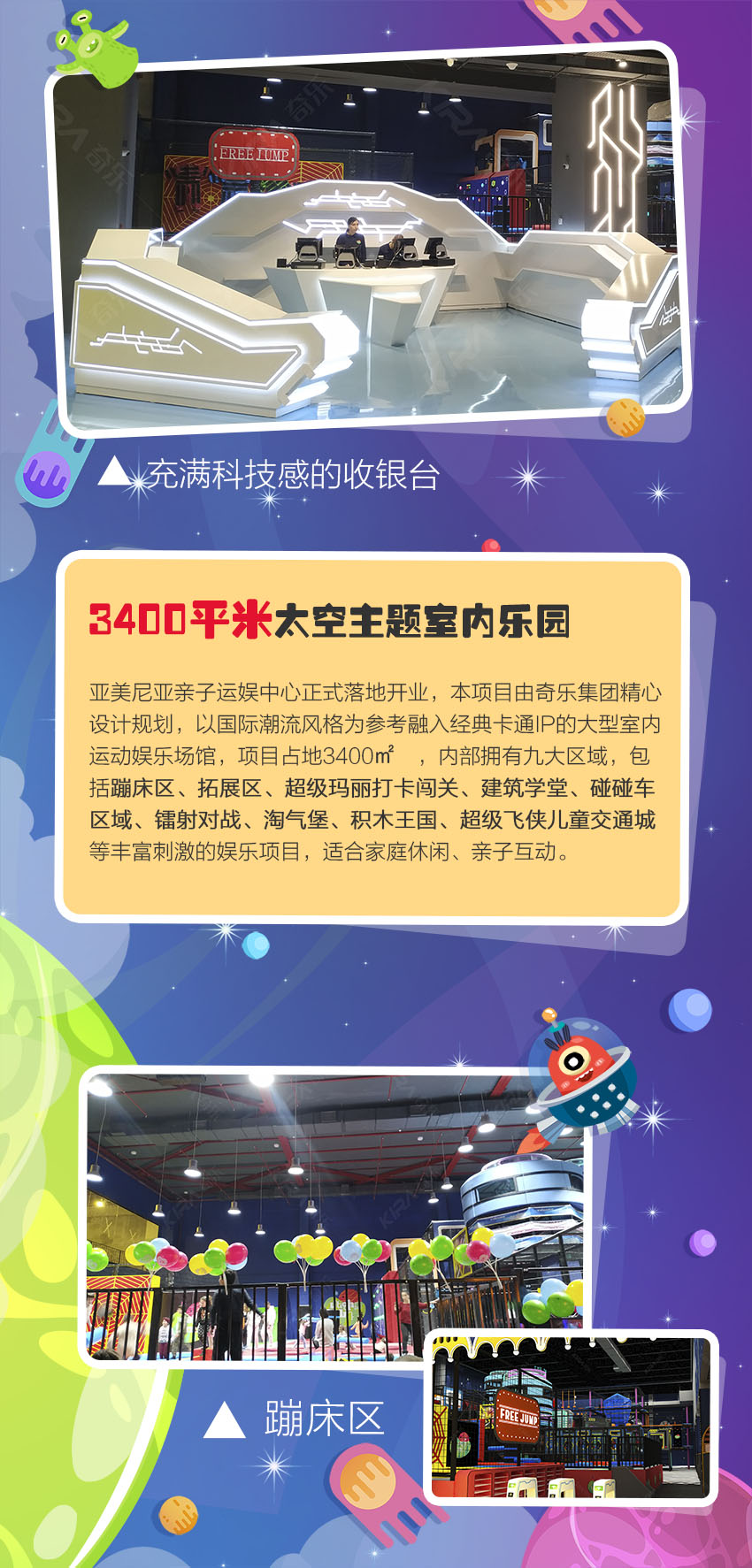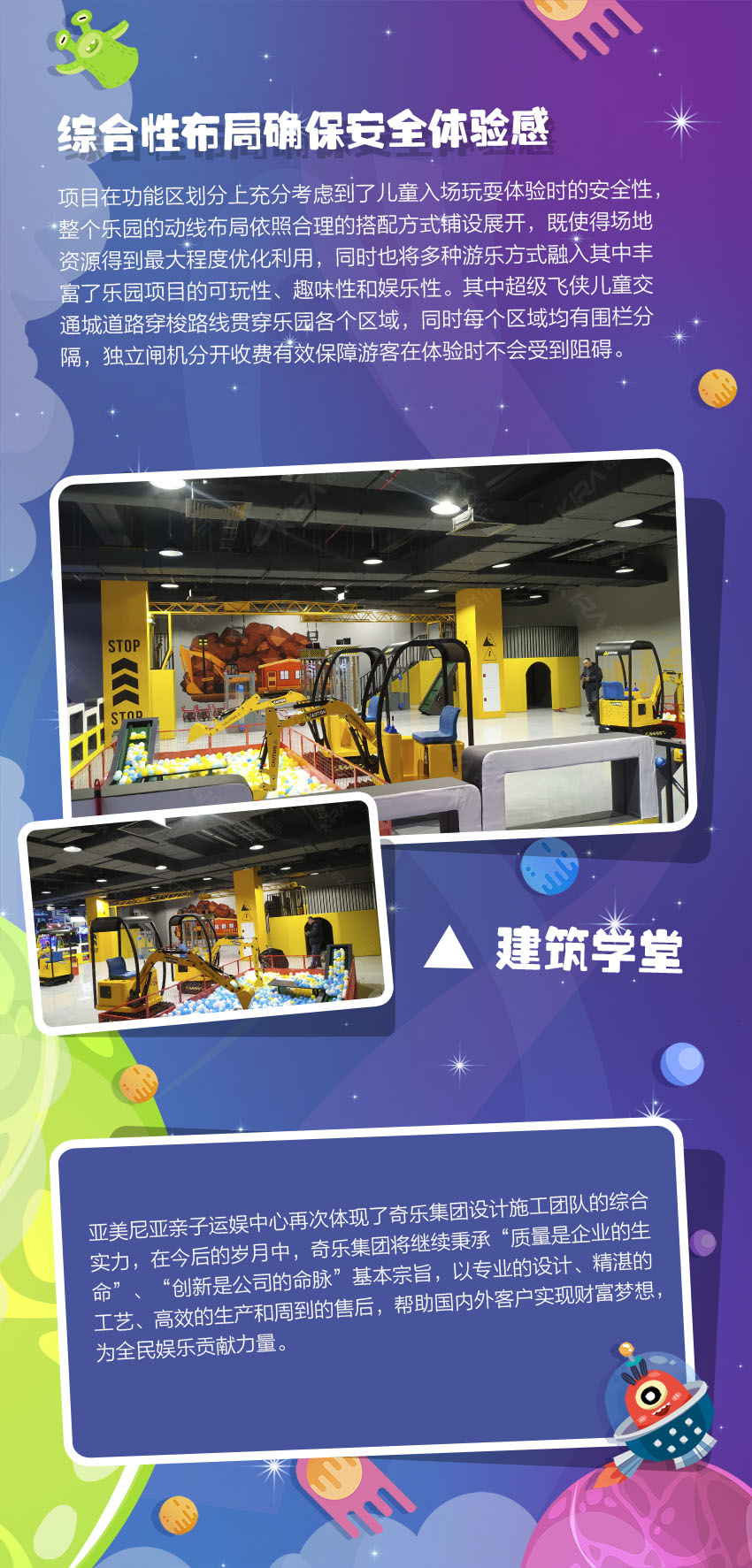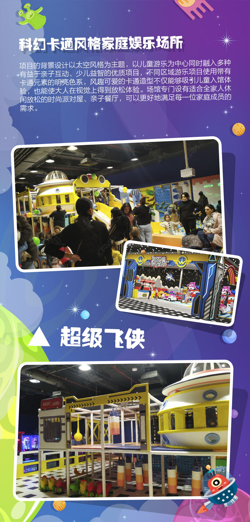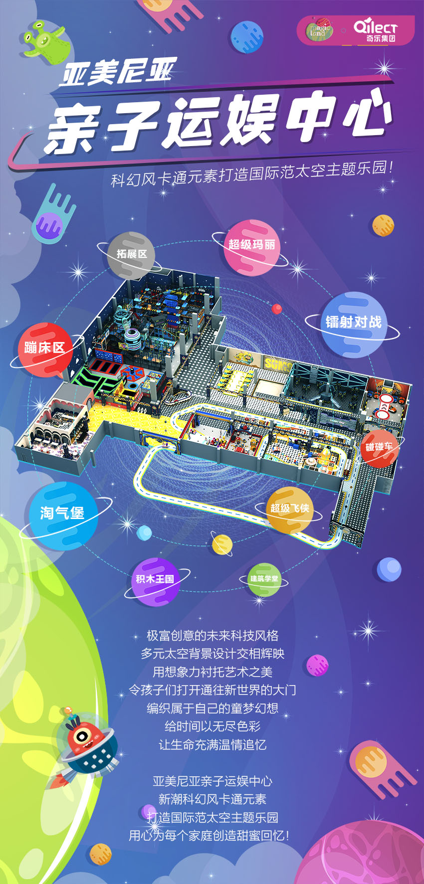 極富創(chuàng)意的未來科技風格,多元太空背景設計交相輝映。用想象力襯托藝術之美,令孩子們打開通往新世界的大門,編織屬于自己的童夢幻想。給時間以無盡色彩,讓生命充滿溫情追憶! 亞美尼亞親子運娛中心,新潮科幻風卡通元素,打造國際范太空主題樂園,用心為每個家庭創(chuàng)造甜蜜回憶!