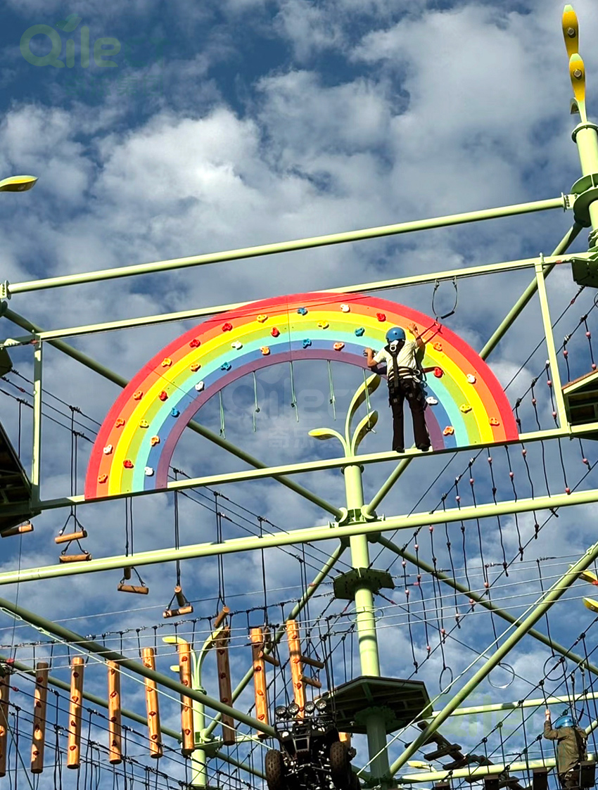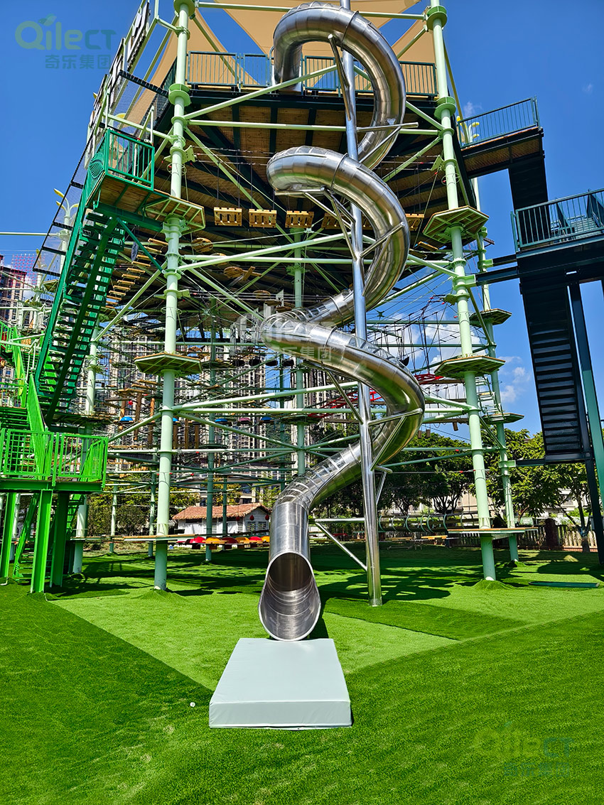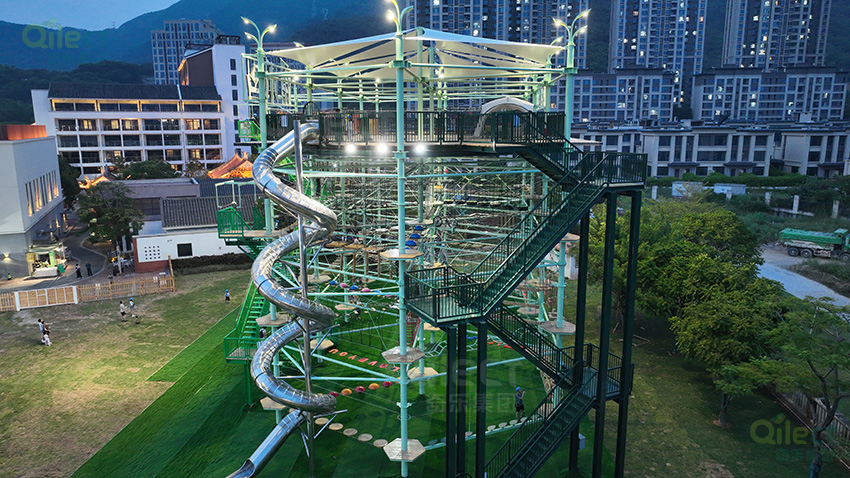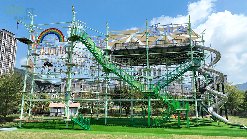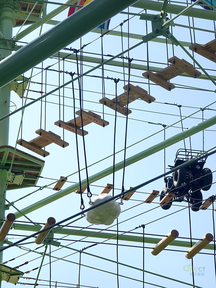 溪禾山探險(xiǎn)水晶塔設(shè)備總面積達(dá)620㎡,總高20m,4層設(shè)計(jì),設(shè)計(jì)了近百個(gè)游玩項(xiàng)目,如旋轉(zhuǎn)尖叫滑梯、高空速降、彩虹橋等。