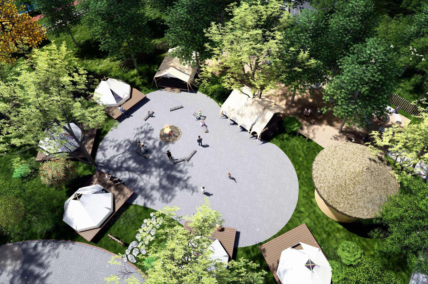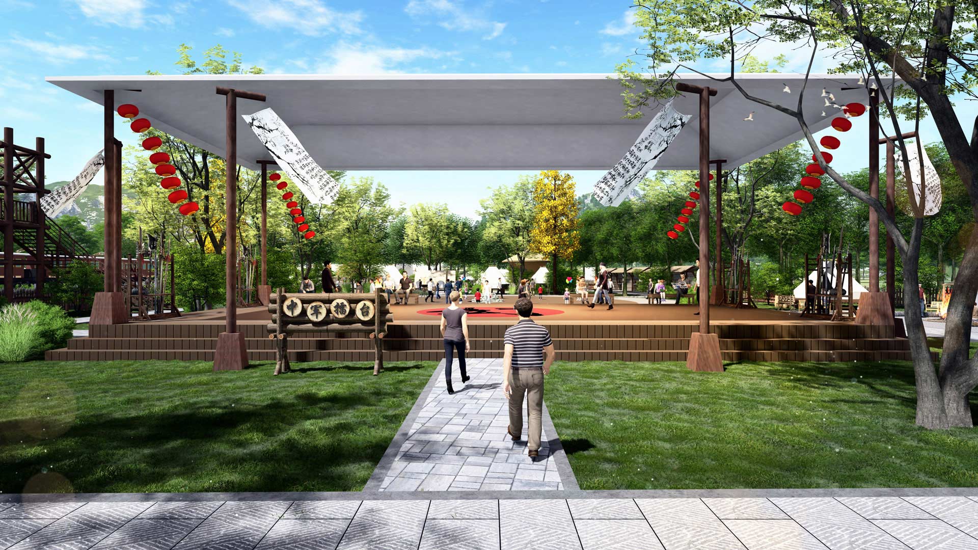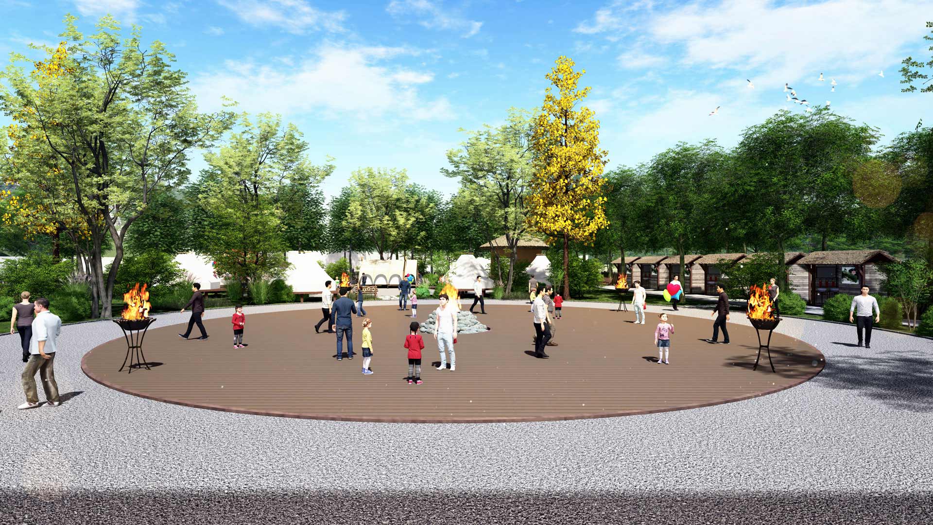 場地以農田和樹林為主,毗鄰河流,并且有一條小溪流途徑場地中央,已建公共衛生間,地勢較為平坦,環境優美。