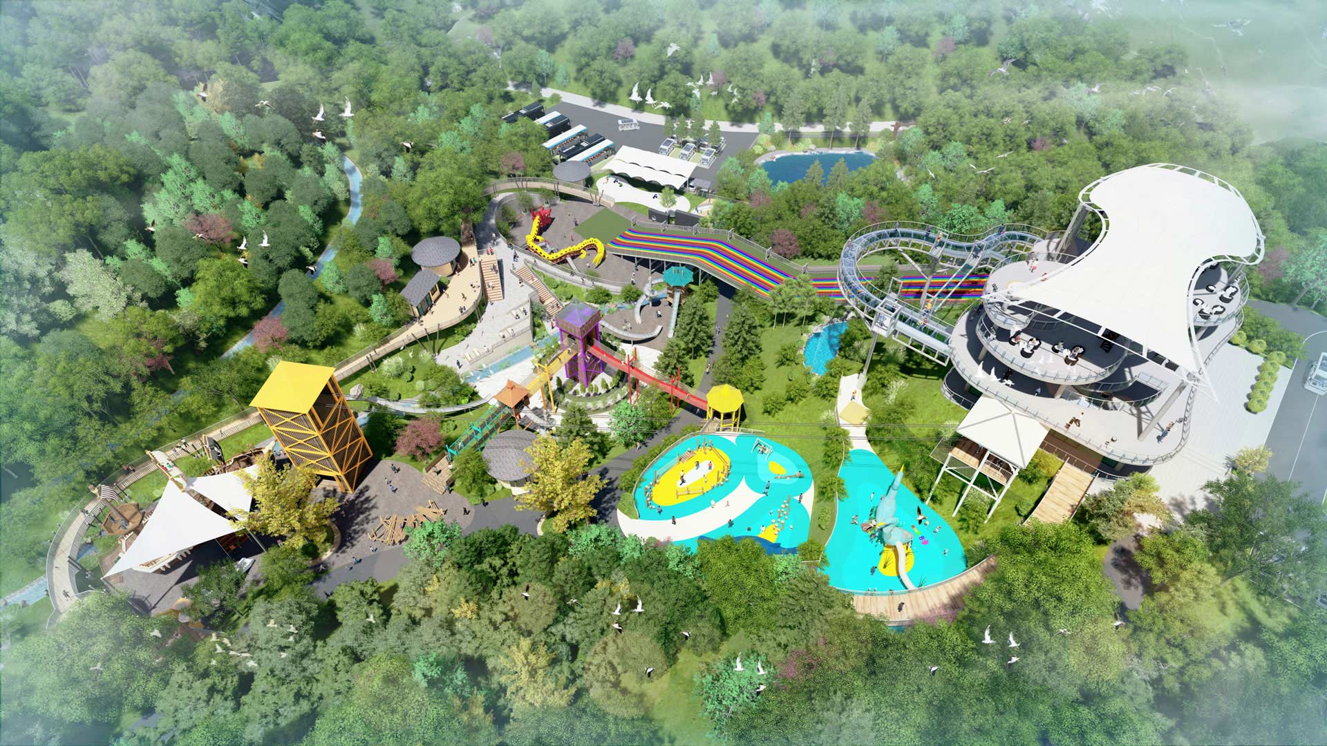 通過(guò)創(chuàng)建各種高架景觀和其他可下沉空間,改變?cè)玖鑱y的地貌,改造山谷、草坪、湖泊和濕地戲水池。在某些地區(qū)優(yōu)化地形,挖掘水面并重新引入廣泛的本地生態(tài)。 結(jié)合當(dāng)?shù)匚幕厣谌肟鬃尤寮宜枷搿⒃⒔逃跇?lè)的傳統(tǒng)文化,以龍、鳥(niǎo)、魚(yú)等為設(shè)計(jì)元素,打造當(dāng)下文化色彩濃郁的集旅游、觀光、研學(xué)、拓展、親子互動(dòng)于一體的綜合型文化旅游景區(qū)。 為強(qiáng)調(diào)景區(qū)自然生態(tài),引入濕地、草地、溪流和干旱地段,激發(fā)與自然不同類(lèi)型的互動(dòng),將景觀整體與周?chē)鷧^(qū)域聯(lián)系起來(lái)。讓景區(qū)的設(shè)計(jì)保留盡可能多的現(xiàn)有樹(shù)木,除了耕種自然景觀外,設(shè)標(biāo)志塔將場(chǎng)地統(tǒng)一成一個(gè)凝聚的整體,從而便利了出入和流通。
